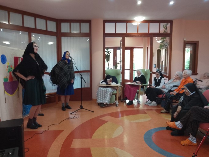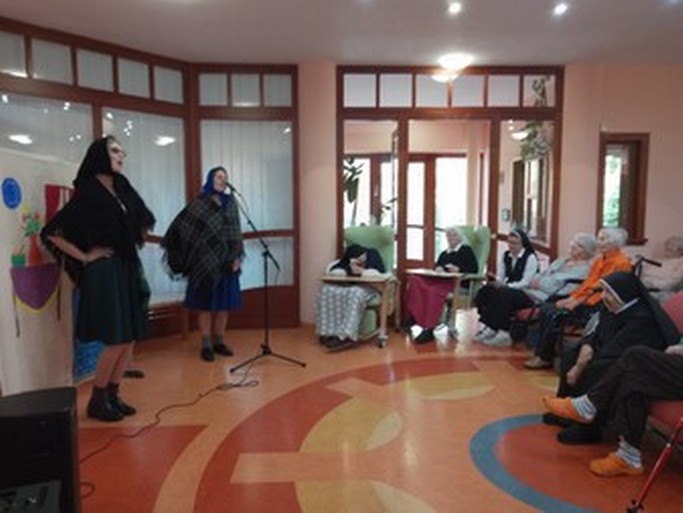 Humorne ladený príbeh dvoch „naj“ kamarátok, popretkávaný ľudovými pesničkami za sprievodu gitary, vyčaril úsmev a dobrú náladu. Spolu s nami si mali možnosť pozrieť predstavenie a zaspievať aj naši hostia z denného stacionára Sv. Kozmu a Damiána. Po záverečnom potlesku a slovách vďaky sme si urobili fotografiu, aby sme si uchovali milú spomienku.