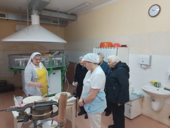Dňa 27.2. 2025 sme sa my, „výprava z Domu sv. Jozefa“, vybrali na exkurziu k „susedom“ do Výrobne hostií, ktorá sídli hneď vedľa nášho zariadenia. Bola to odpoveď na prosbu našich prijímateliek, ktoré túžili vidieť na vlastné oči, ako sa pečú hostie. Pri vstupe nás privítala sestra Klarissa - vedúca výrobne. Exkurziu sme začali pri soche pápeža sv. Pia X. On sa zvykne označovať ako svätec Eucharistie, preto si ho sestry CJ zvolili za patróna výrobne už pred viac ako 100 rokmi.